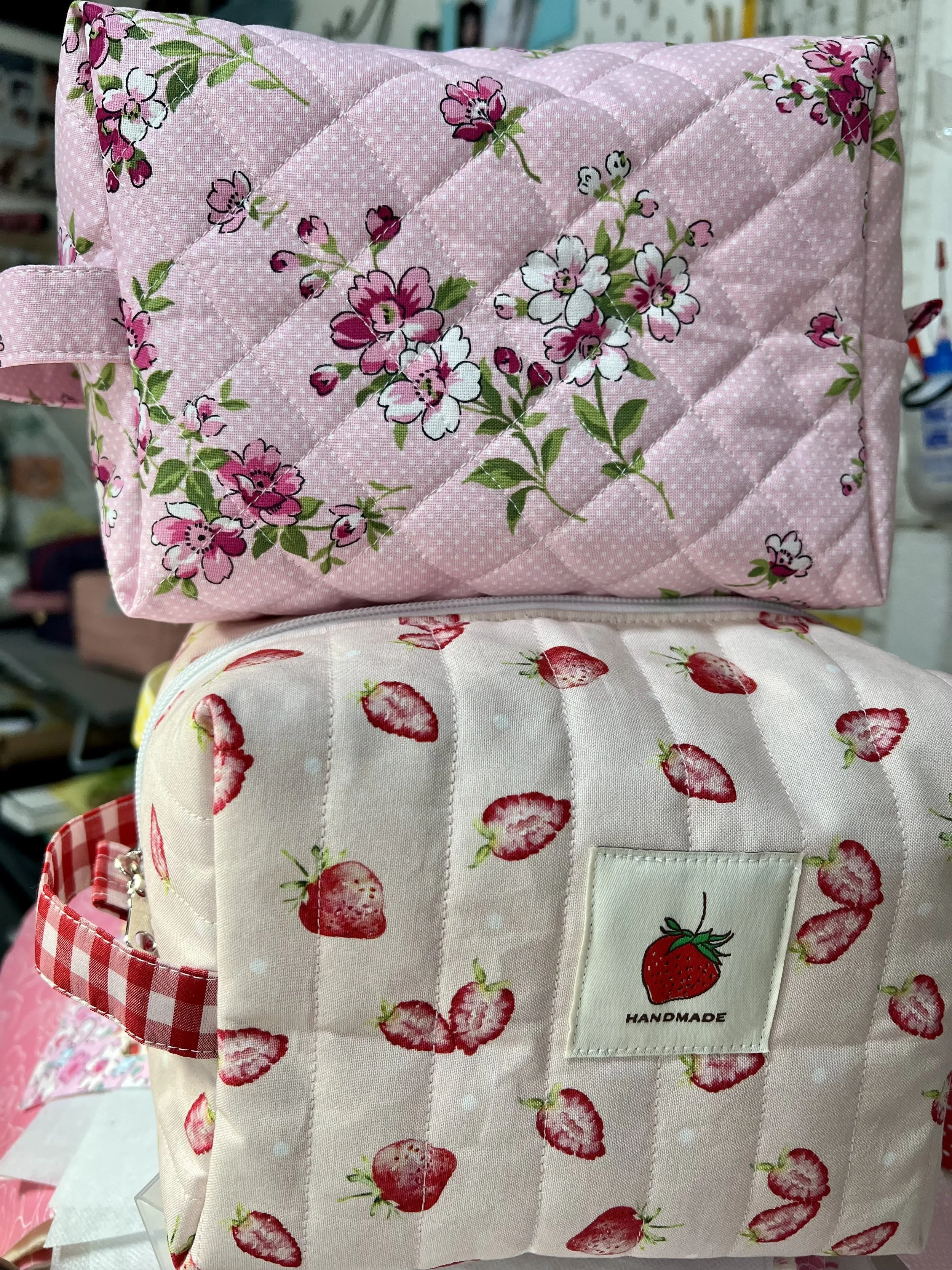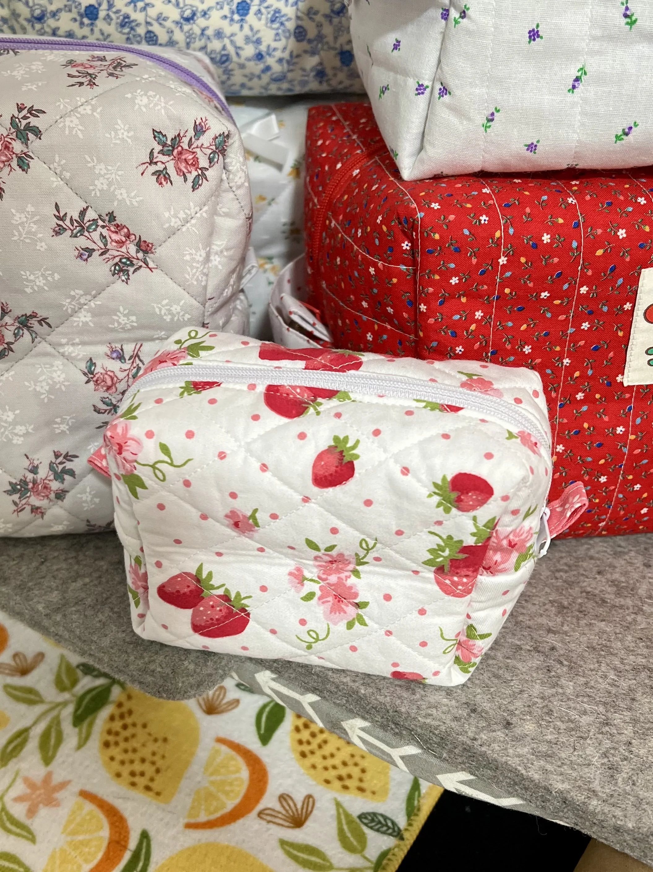 Small quilted fabric pouch with a strawberry pattern and a zipper, surrounded by larger quilted fabric bags with floral and fruit patterns.