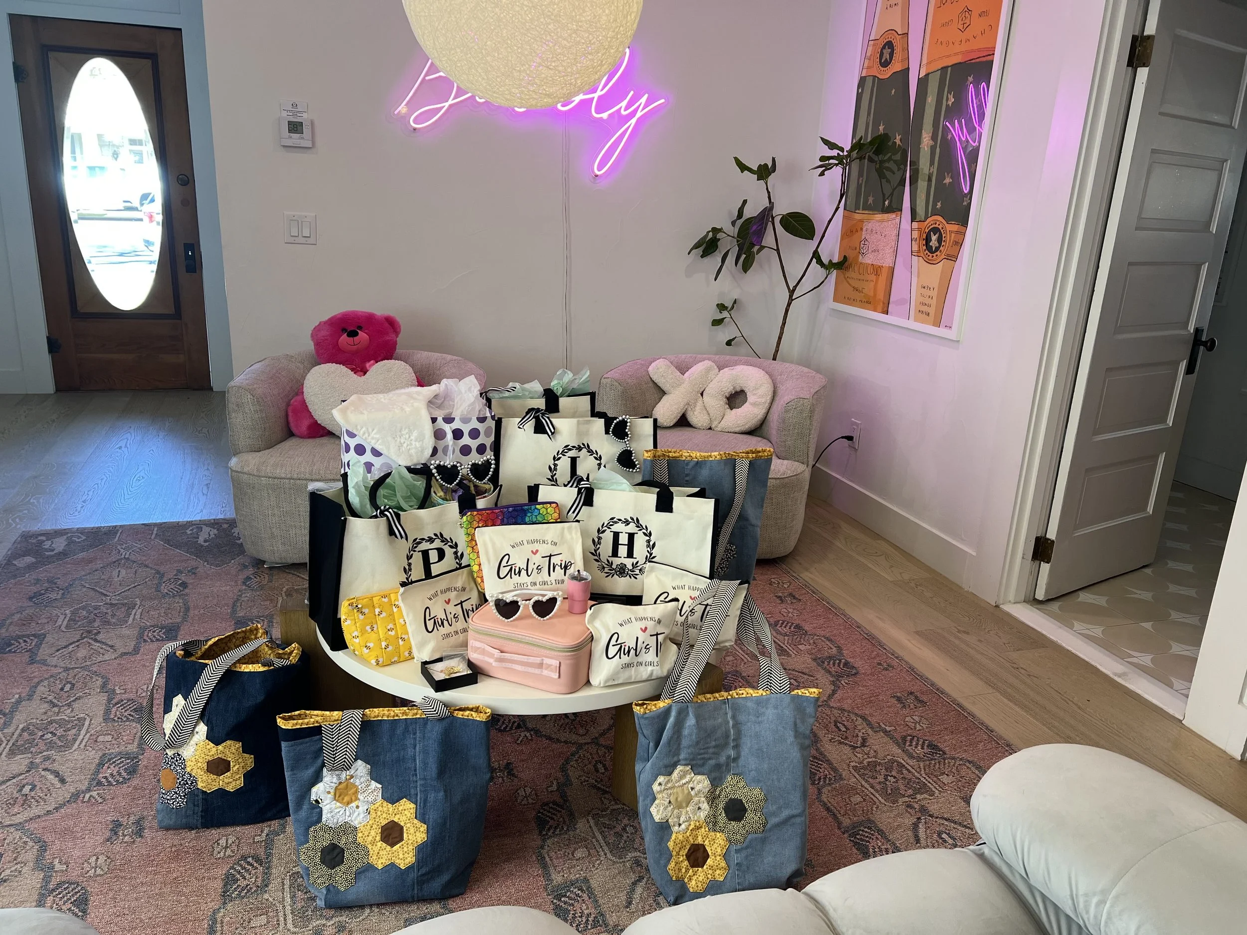 A living room corner decorated for a girl’s trip, featuring a pink neon sign that says 'Bubbly,' a pink teddy bear holding a heart, a white table with gift bags and matching tote bags decorated with hexagons, a pink luggage piece, a pair of heart-sha