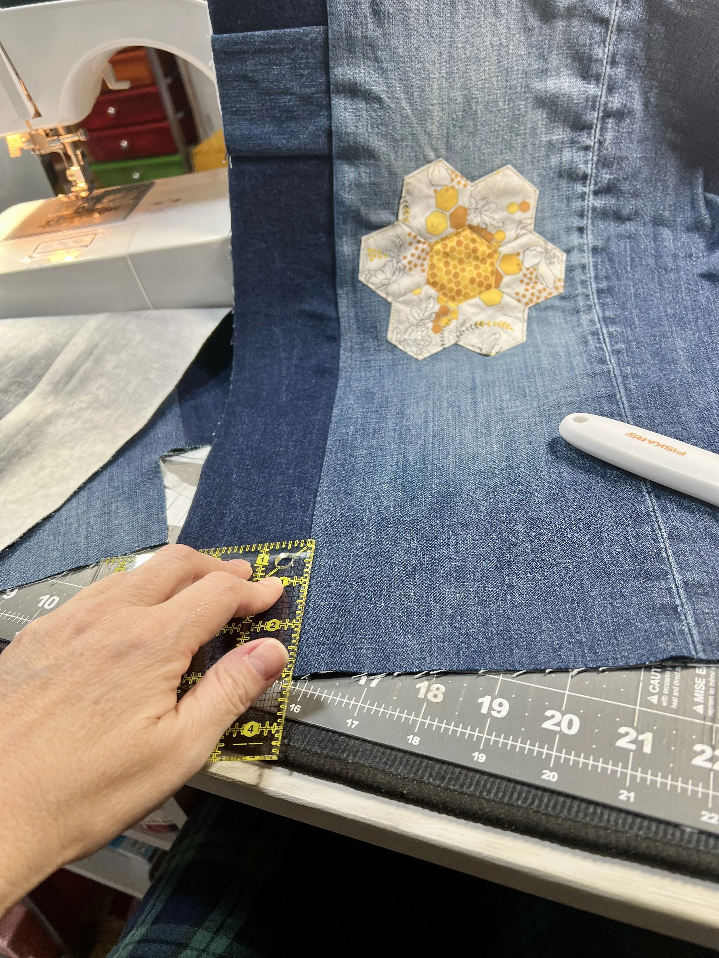Close-up of a sewing project on a cutting mat, with a person's hand holding a small ruler to measure fabric, a piece of denim fabric with an embroidered honeycomb and bee pattern, and a white fabric pen. In the background, a sewing machine is visible