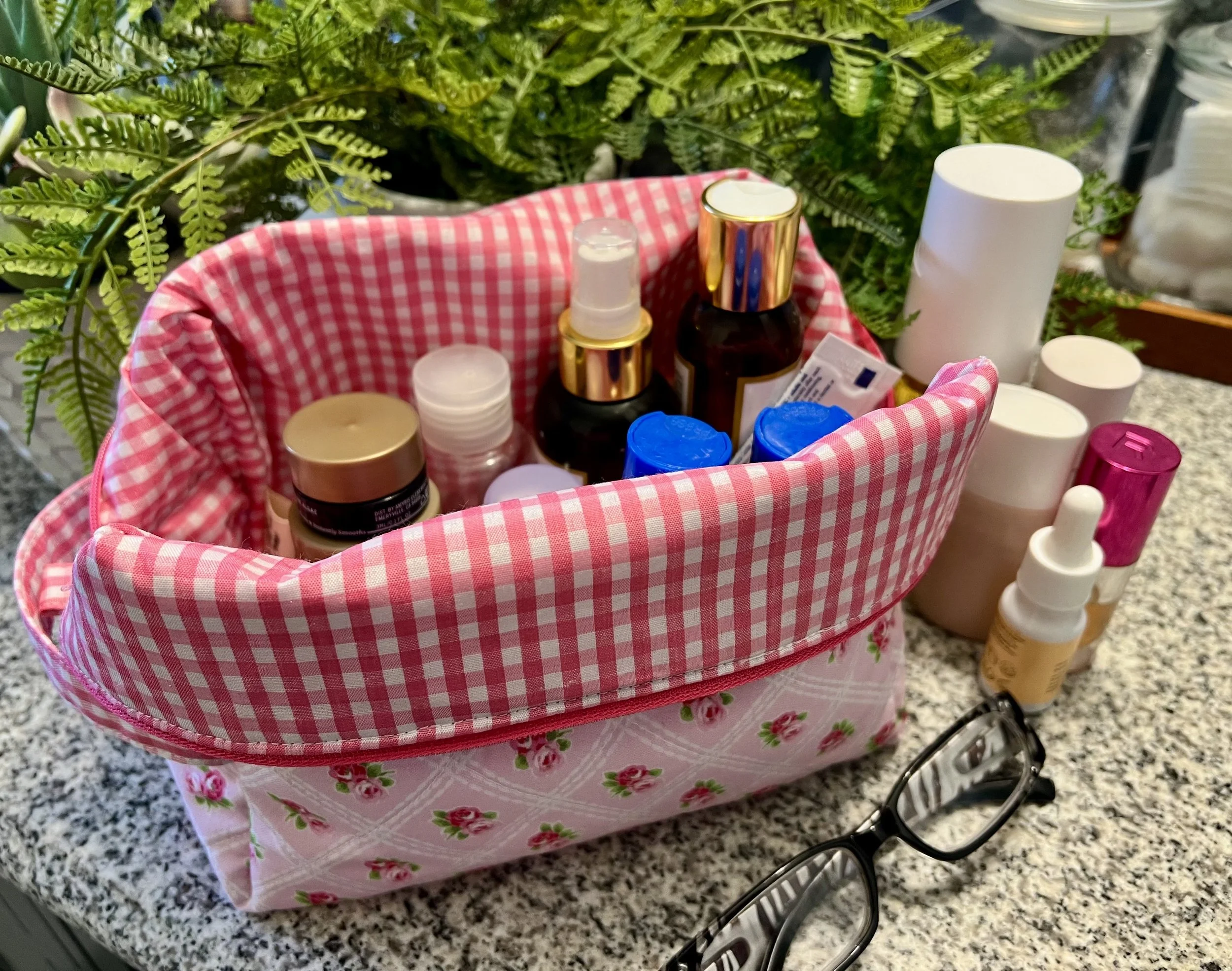 A floral patterned makeup bag surrounded by skincare and cosmetic bottles, a pair of black glasses, and green potted plants on a granite countertop.