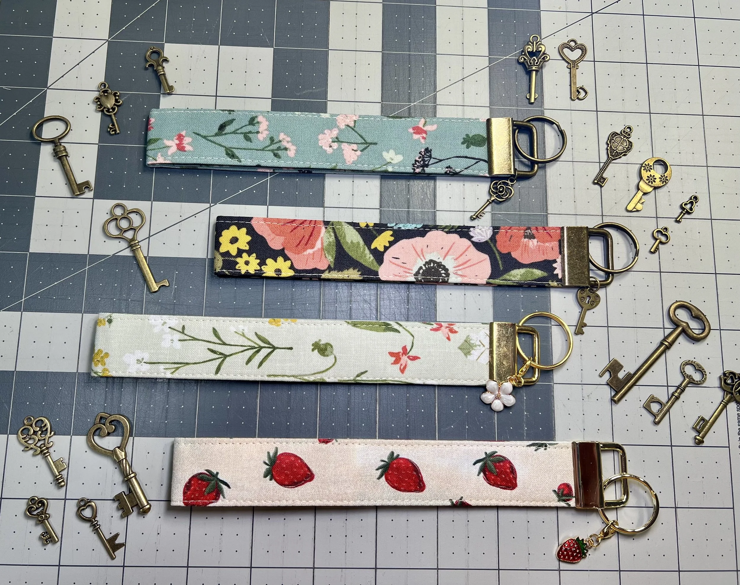 Four fabric keychains with floral and strawberry patterns, each with a metal keyring and small decorative charms, surrounded by various small antique-style keys.