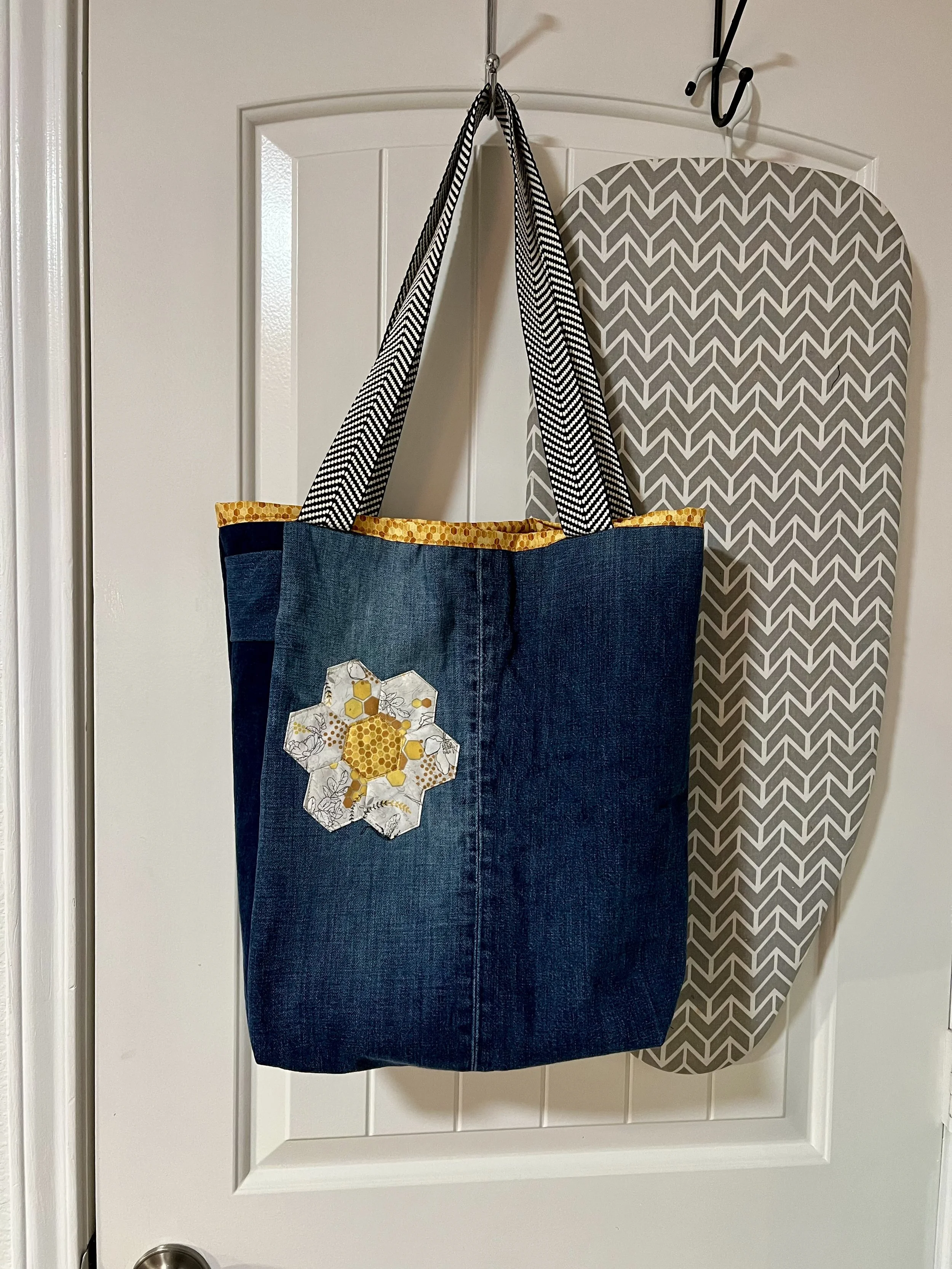A DIY denim tote bag decorated with hexagon quilt patches in yellow, black, and beige, hanging on a door hook, with an ironing board in the background.
