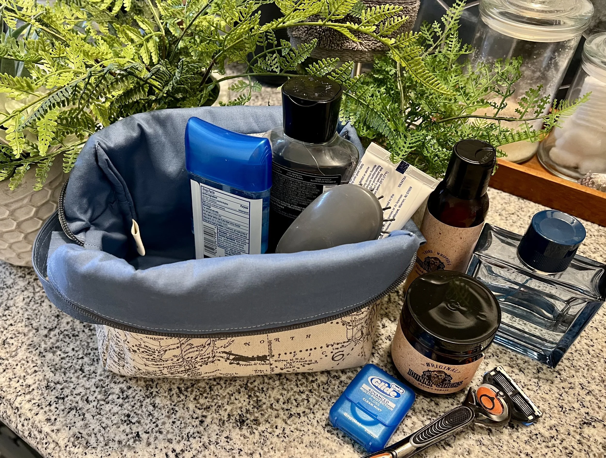 Travel toiletry bag with a map design on a kitchen countertop, surrounded by bottles of grooming products, a jar of organic pomade, and a razor. A green plant and various kitchen items are in the background.
