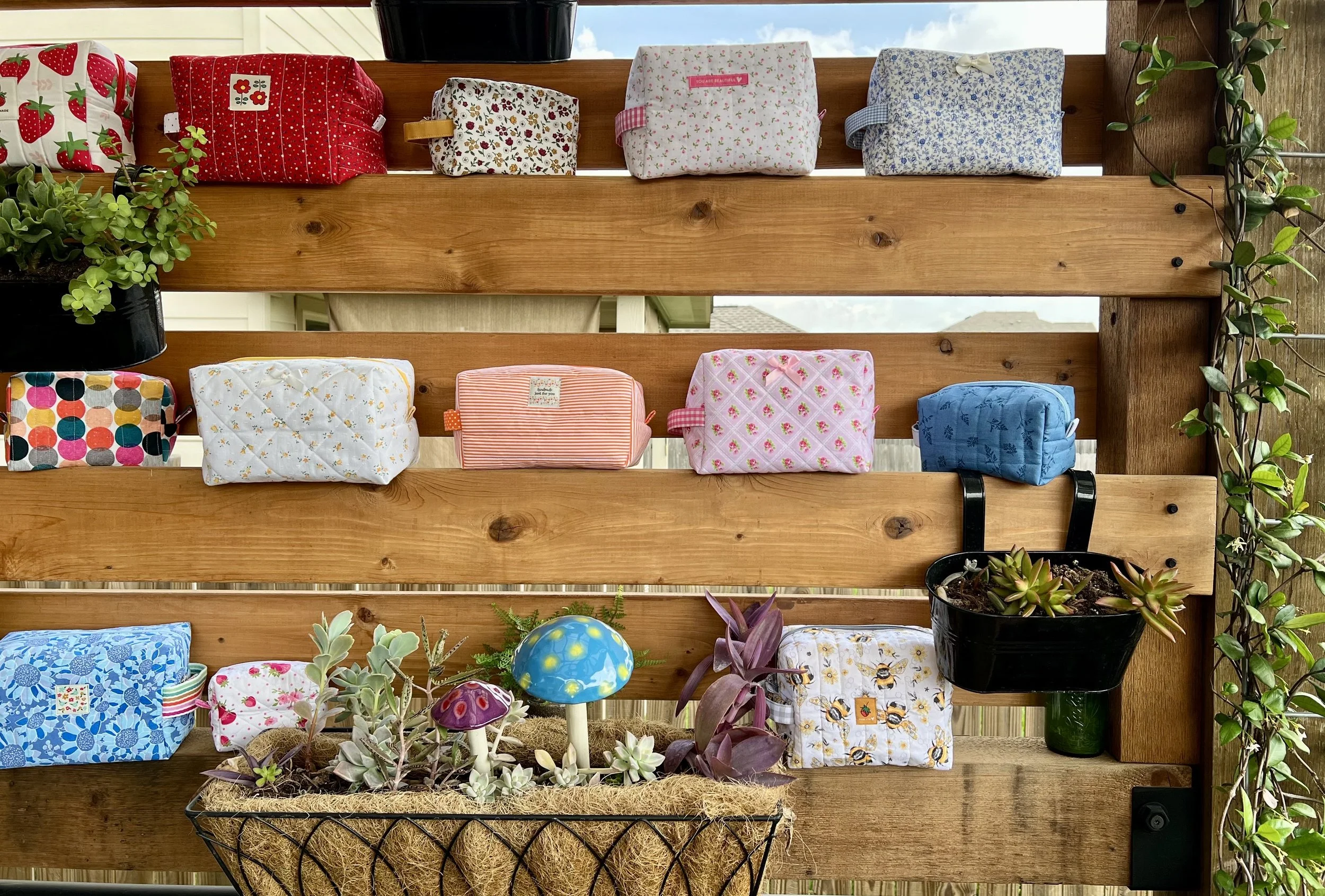 Colorful handmade fabric pouches and a patchwork quilt displayed on wooden shelves with potted plants and decorative mushrooms outdoors.