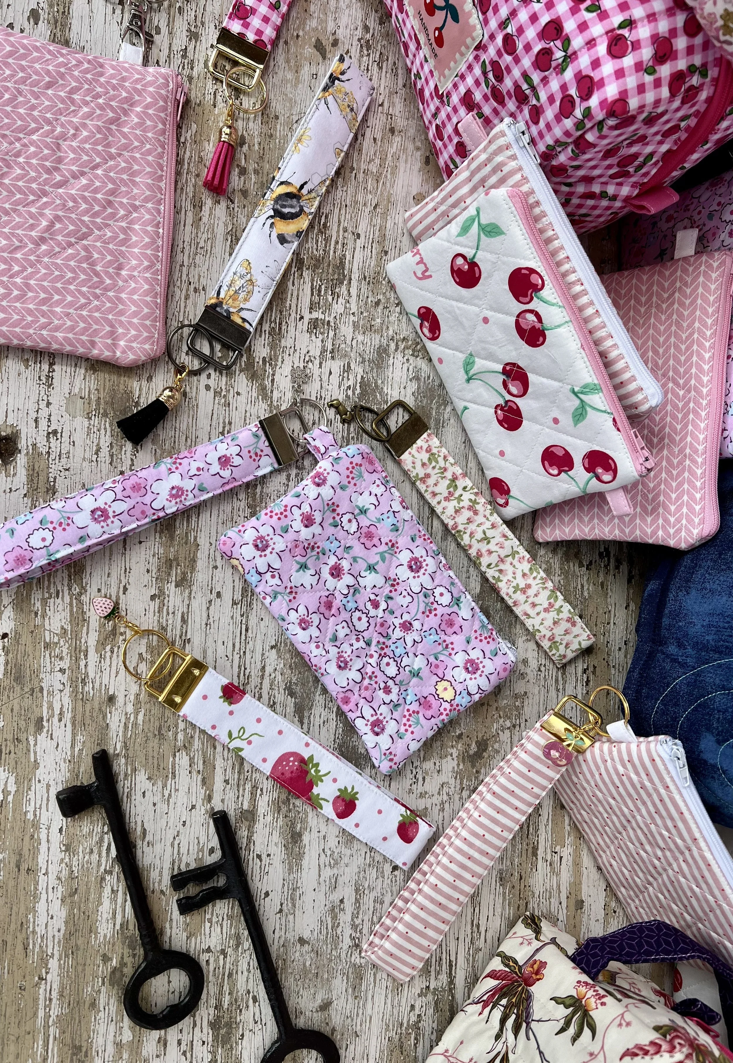 Collection of pink and floral fabric pouches and keychains on a distressed wooden surface.
