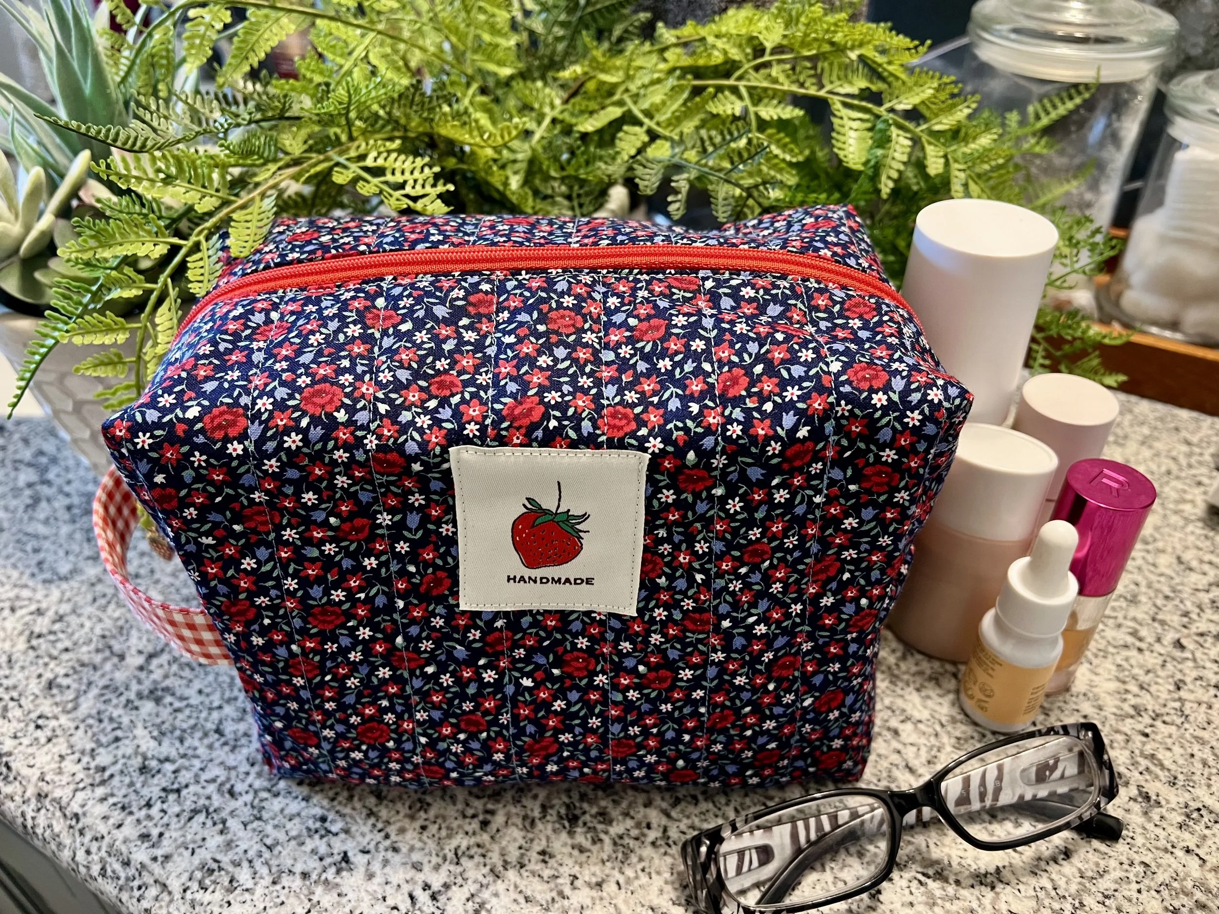A floral-patterned bag with a red zipper and a label with a strawberry logo that says "Handmade" on a speckled countertop. Surrounding the bag are white bottles, a pink spray bottle, a small brown bottle, black glasses, and green plants in the backgr