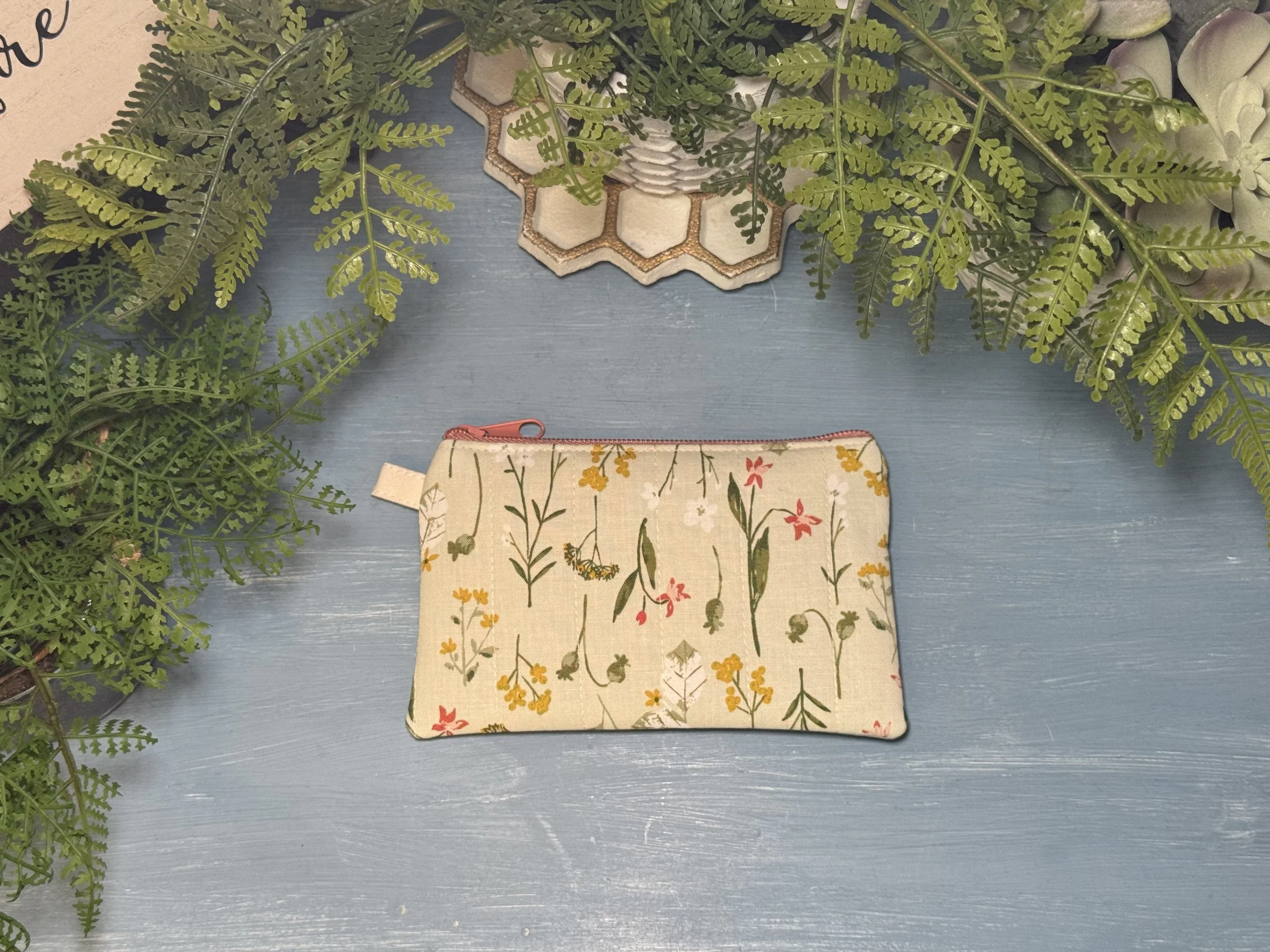 A floral patterned zippered pouch on a blue wooden surface, with green fern plants and a decorative ceramic item around it.