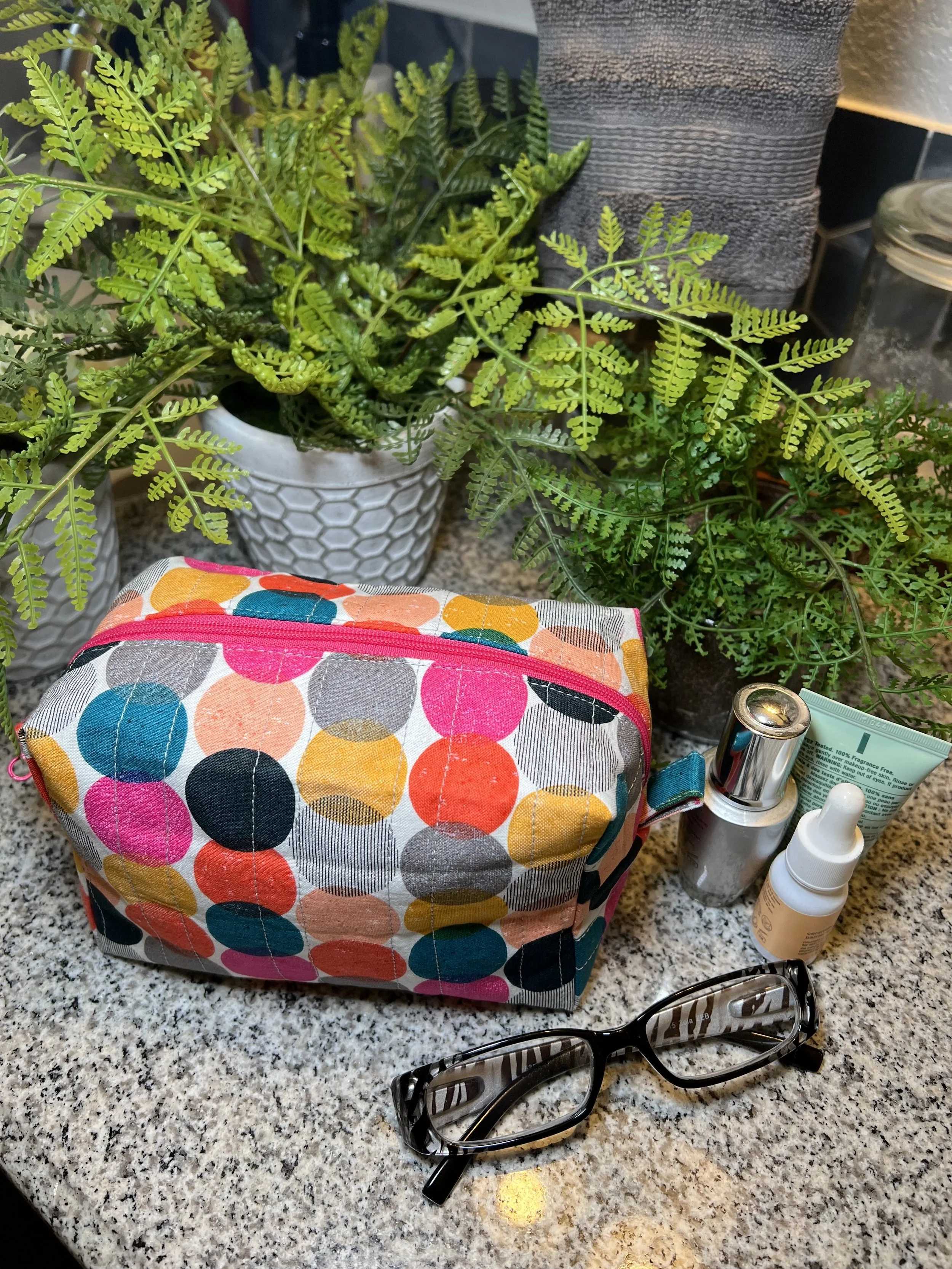 A colorful polka dot makeup bag on a granite countertop surrounded by green potted plants, eyeglasses, a silver spray bottle, a white dropper bottle, and a tube of cream.