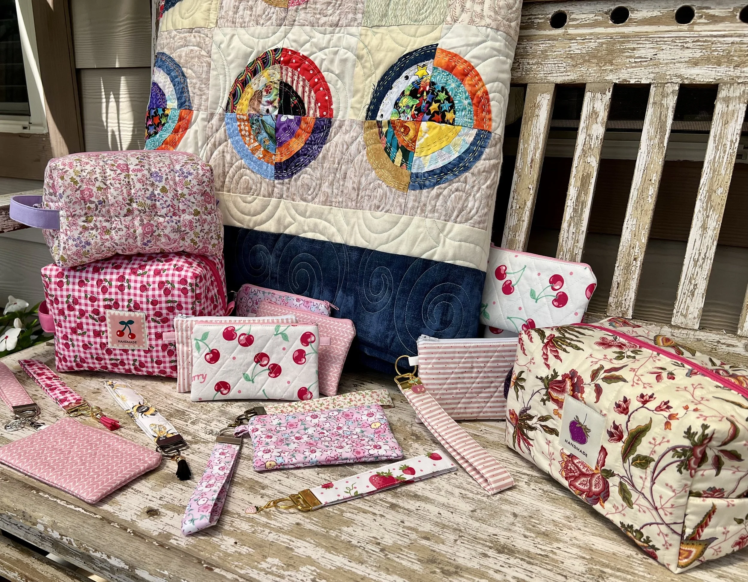 A collection of handmade fabric pouches, keychains, and a quilt with colorful patchwork circles, set on a weathered wooden table with a distressed bench and a floral quilt in the background.